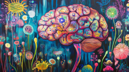 This vibrant and abstract artwork showcases a brain entwined with colorful floral elements, symbolizing creativity and imagination. The vivid colors and intricate patterns inspire thought and emotional expression.