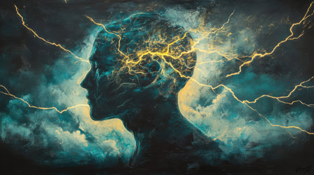 A man's profile is vividly illustrated with swirling clouds and vibrant energy bursting with luminous lightning. The artwork evokes a sense of mystery and depth.