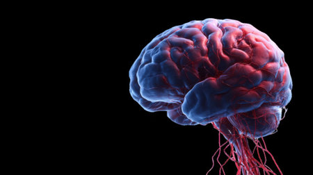 Human brain anatomy 3D illustration showing nervous system and blood vessels