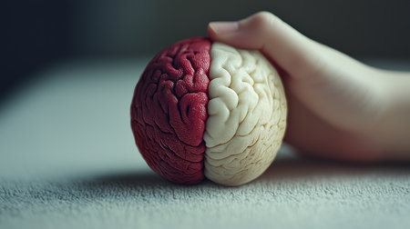 A close-up view of a hand gripping a brain model, showcasing contrasting red and white halves, representing different aspects.