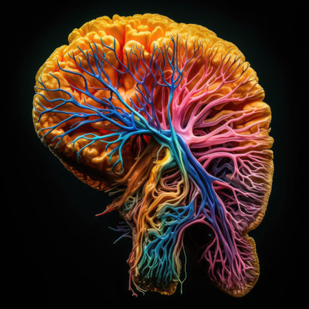 This vibrant and imaginative representation of a brain showcases intricate details and vivid colors, merging art and science to explore the complexities of the mind.