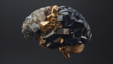 A conceptual human brain, sliced and crafted with faceted stone and gold, set against gray