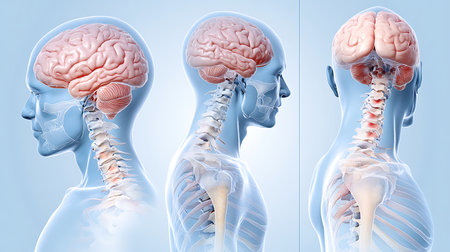 An illustration shows a side view of a human skull with transparent detailing revealing the brain and spinal cord highlighting anatomical features.