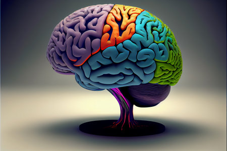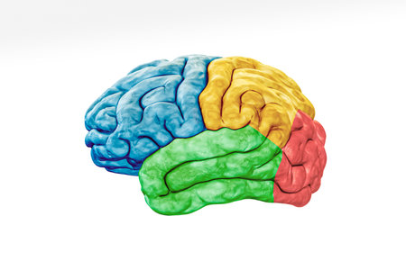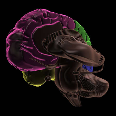 Cerebral cortex lobes in color profile view isolated on white background accurate 3D rendering illustration. Human brain anatomy, neurology, neuroscience, medical and healthcare, biology concept.
