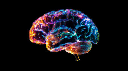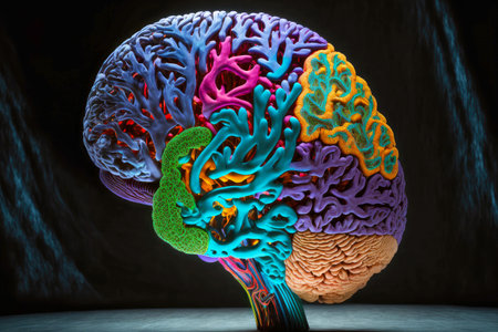 This artwork features a detailed brain against a colorful, abstract background depicting neural patterns.