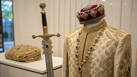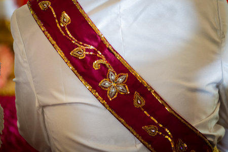 A closeup of a traditional ceremonial outfit passed down through generations of leaders or religious figures in the community