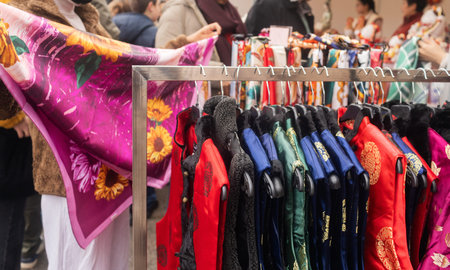 Traditional Chinese clothing at the fair. Lunar New Year parade, Asian community. Festive atmosphere, cultural diversity. Ideal for travel, culture, festival promotion and editorial design.