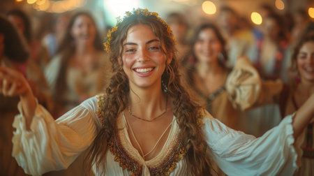 KOLKATA , INDIA - MARCH 1, 2018 : Beautiful young girls with spring festive make up with flowers , joyful dance at Holi or Spring festival, known as Dol -in Bengali or Holi -in Hindi language.