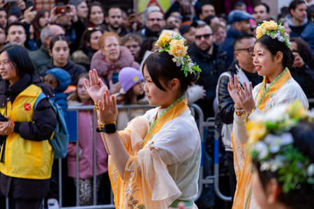 PARIS, FRANCE - FEBRUARY 17, 2019. Last day of the chinese new year celebration festival in street. People dancing in the street during the parade festival with traditional costume