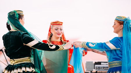 Young women dressed in traditional folk costumes dancing Azerbaijani