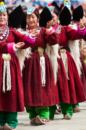 LEH, INDIA - SEPTEMBER 08, 2012: Women in traditional Tibetan clothes performing folk dance. Annual Festival of Ladakh Heritage in Leh, India. September 08, 2012