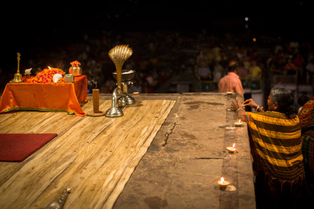 VARANASI, INDIA - MAR 15, 2018: Pilgrims during perform Agni Pooja (Sanskrit: Worship of Fire) on Dashashwamedh Ghat - main and oldest ghat of Varanasi located on the Ganges.