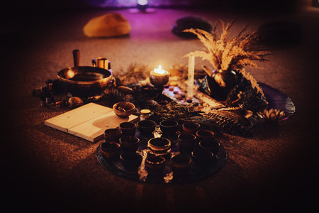 A serene scene featuring a burning incense in an ornate holder, surrounded by traditional offerings and red fabrics, creating a mystical and spiritual atmosphere.