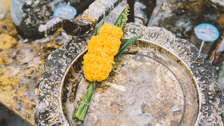 Group of Balinese people attending a Melukat water purification ceremony at Tirta Empul Temple in Bali, Indonesia