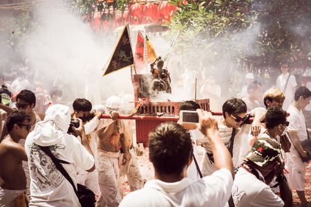 PHUKET- OCT 07 : Taoism participants in a street procession of the Phuket Vegetarian Festival on Oct 07, 2016 in Phuket, Thailand. During festival devotees abstain from eating meat to appease the God.