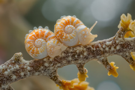 Two vibrant spiral patterned snails are slowly moving along a branch covered in fine textures. The branch features small yellow blossoms and is set against a soft green background creating a peaceful atmosphere