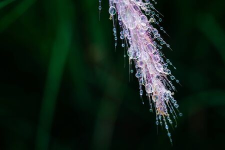 closeup grass flower with droplets in green field