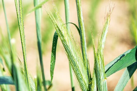 ears of corn in the field, macro a drop of dew or rain.. Wheat ear in droplets of dew in nature on a soft blurry gold background