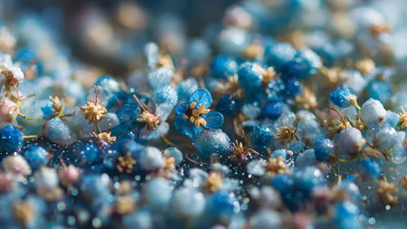 Macro shot of a cluster of tiny blue and white flowers with yellow centers, creating a delicate floral background.