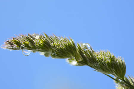 Closeup of grass spikelet with water drops on background of blue sky