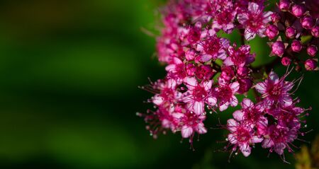 Bunches of pink flowers of a grassy sedum plant also known as Hylotelephium spectabile, an ice plant, a brilliant stonecrop and a gray-haired butterfly, depicted growing on a summer flowerbed