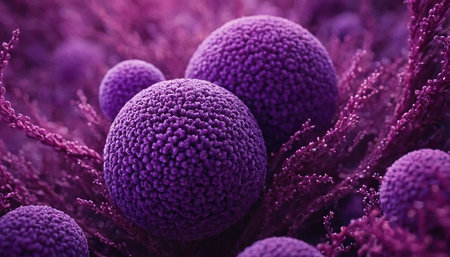 This image features numerous spherical structures with a distinct textured surface. The primary focus is on a prominent sphere, while others are partially visible in the background, creating depth. The composition utilizes a blurred effect, likely in a dark environment with blue and yellow hues. Suitable for scientific, educational, and abstract design purposes.