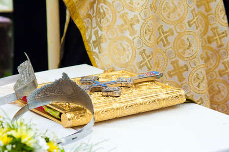 priest blessing wedding rings with holy water for wedding ceremony in church, space for text. religion concept