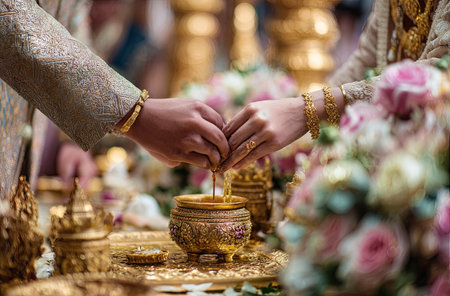 Close-up shows hands performing a ritual with gold elements and floral decorations. Soft lighting illuminates the scene, highlighting the textures of clothing and ornaments. The composition suggests a celebratory event. Suitable for illustrating cultural practices or symbolic themes in various commercial applications.