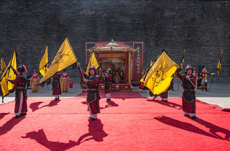 Xian, China - April 30, 2010: Welcome ceremony show in front of North Gate of Shuncheng City Wall. Group of dancers with yellow flags on red carped against black stone wall and royal cabin.