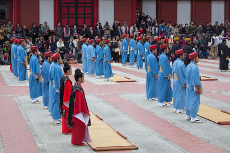 Okinawa, Japan - January 02, 2015: Dressed people at the traditional New Year celebration at Shuri-jo castle.