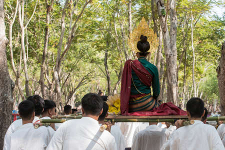 traditional dresst thai people at the Loy Krathong Festival in the Historical Park in Sukhothai in the Provinz Sukhothai in Thailand. Thailand, Sukhothai, November, 2019