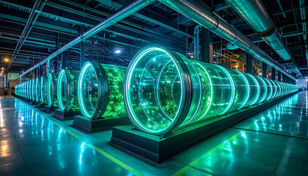 Rows of high-tech equipment glow softly under fluorescent lights in a vast industrial space.