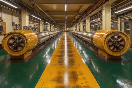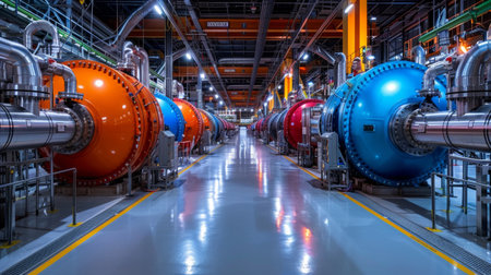 A captivating view of a modern industrial facility featuring large turbines and advanced machinery in a well-structured environment emphasizing technology and engineering.