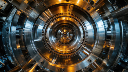 Close-up of precision-engineered metal gears inside a modern industrial machine, polished to a futuristic metallic sheen.