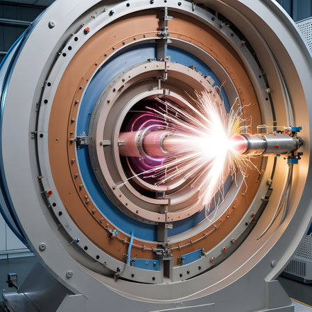 A close-up view of a state-of-the-art particle accelerator tube showcasing blue energy flow, highlighting advanced technology in a scientific research environment.