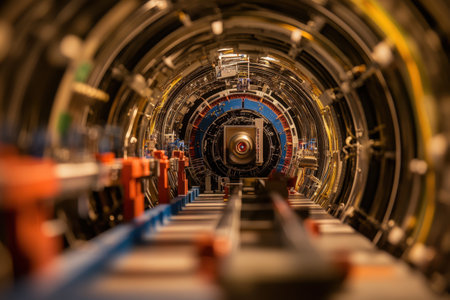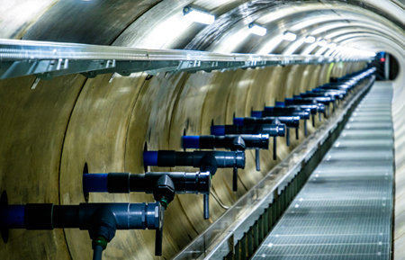 Intricate pipe network and equipment inside the expansive tunnel of the large hadron collider