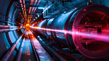 A breathtaking tunnel displays a particle accelerator featuring a glowing beam line and advanced detector arrays used in high-energy physics.