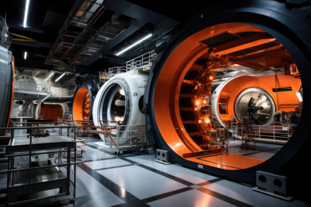 Nuclear reactor bathed in diffused natural light from above, highlighting its components. Generative AI