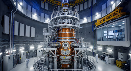 The interior of a high-tech research facility, showcasing a massive and complex nuclear fusion reactor (tokamak). Scientists in clean suits can be seen working around the advanced machinery, which represents the future of clean energy and cutting-edge physics research.