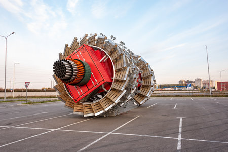 Mytishchi, Moscow region, Russia - October 2, 2020: Sculpture Engine of trade. Side view from the side of pipes and hoses.