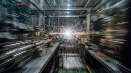 long-exposure photograph inside a highly technical scientific, capturing a brilliant flash of light at the center of complex machinery, amplified by extreme motion blur effects, conveying speed, laboratory innovation, and futuristic science.