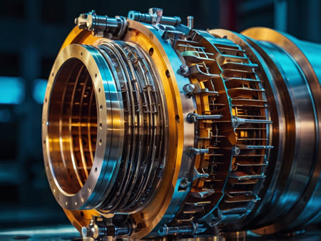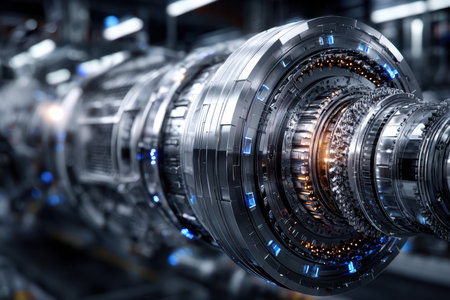 Close-up view of advanced machinery components in a vibrant manufacturing facility. Focus on high-tech engines and the intricate assembly process involved in production.