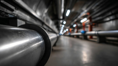 Metal pipe industrial network connection infrastructure silver construction engineering geometric tunnel, shiny metal pipe network industrial