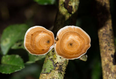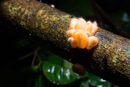 Champagne orange mushrooms Small mushrooms that grow on damp logs in the jungle.