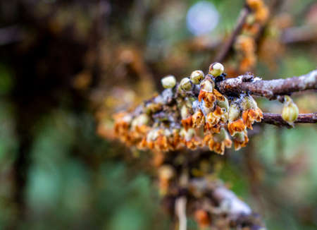 Close up of small flowers budding on branch tree at the forest with copy space.