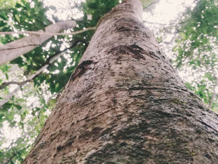 Green Jungle Tree against blue sky, with some withe clouds . Nature Concept. Look Up View in Tropical Forest. Looking up to the sky along a tree trunk. Close up a tropical tree