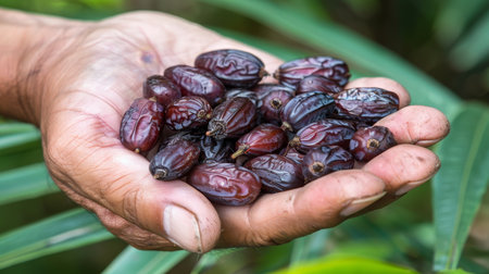 Hand holding sweet dates, date selection on blurred background with copy space for text placement