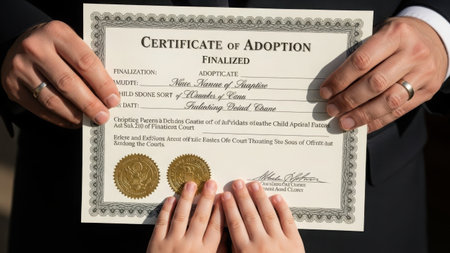 The image depicts a momentous occasion where a certificate of adoption is being finalized. Two individuals, likely the adoptive parents, are holding the certificate together, signifying the official completion of an adoption process. The certificate is ornately designed with a formal border and includes details such as the names of the adoptee and the adoptive parents, the date, and a seal. The scene conveys a sense of joy, accomplishment, and the beginning of a new family chapter.