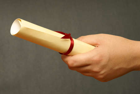 A blank diploma or a mockup certificate in the hand of a man employee wearing shirt on black background