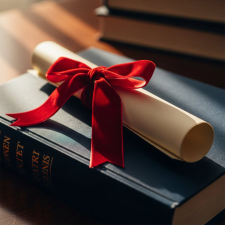 Diploma with red ribbon on a book. Education concept. Selective focus.